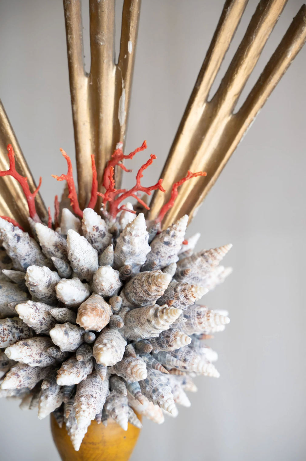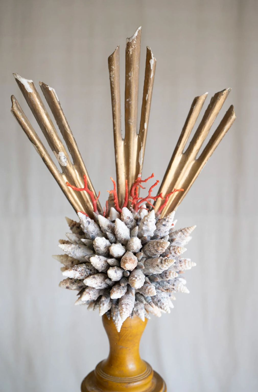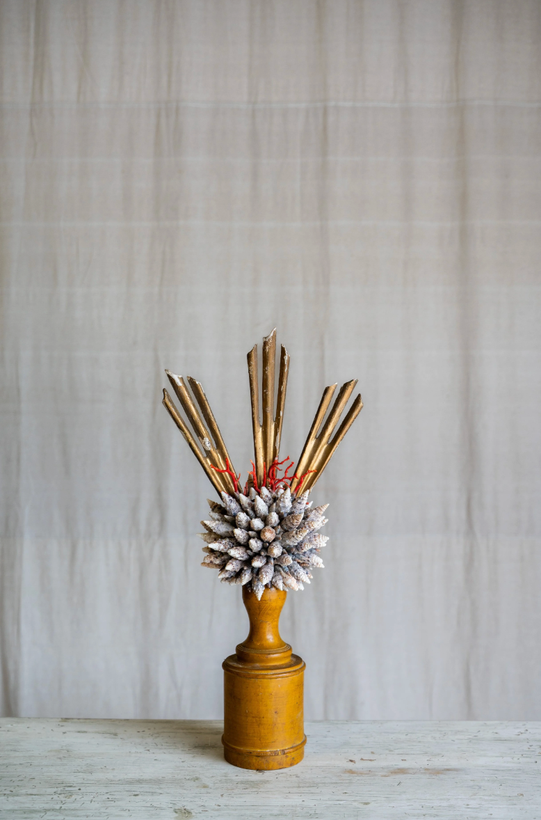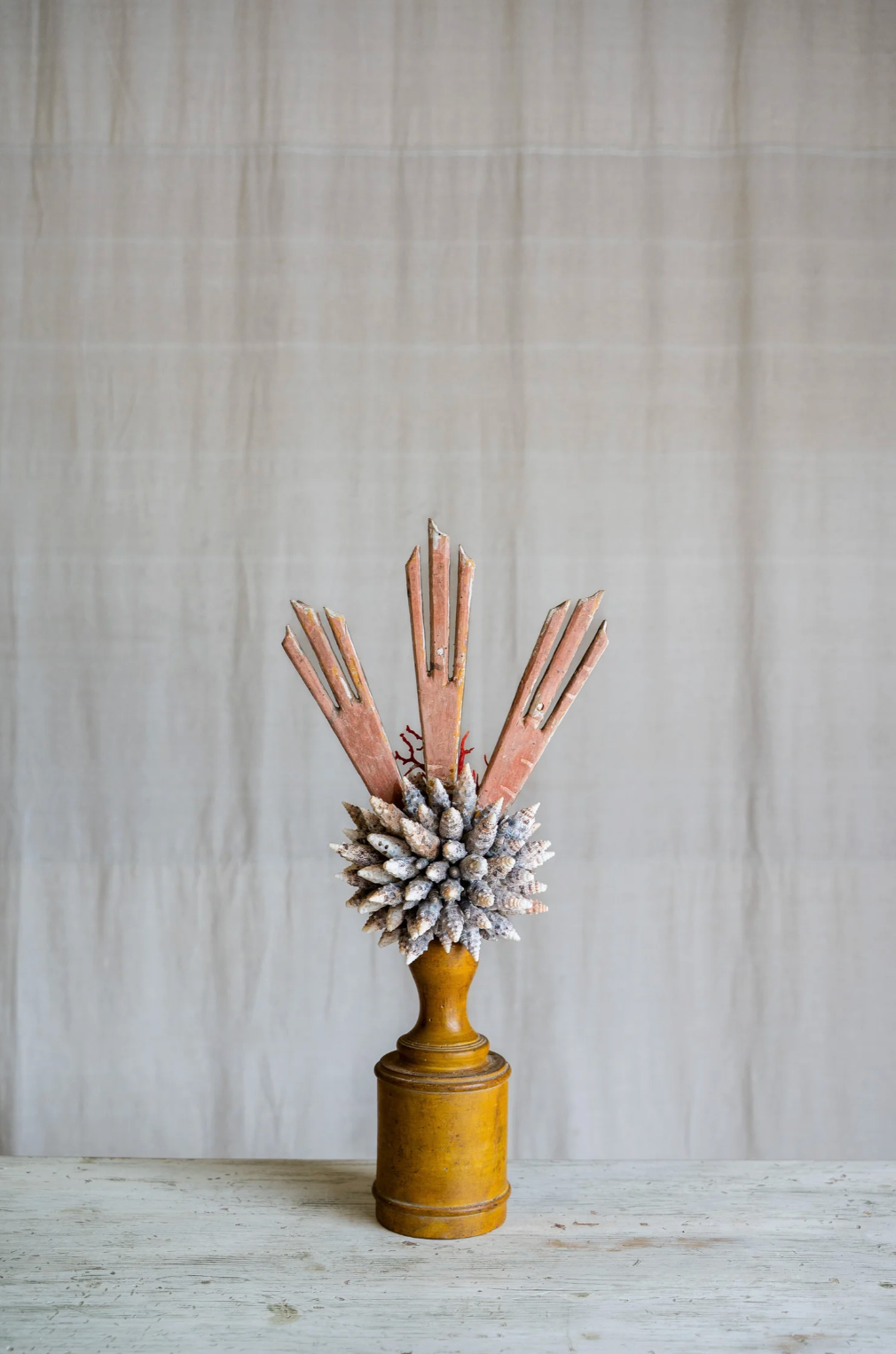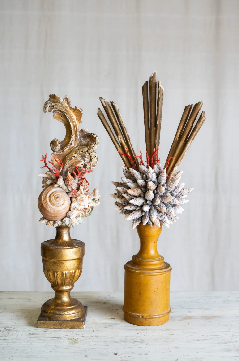 Ondella brings coastal elegance to any space with its stunning arrangement of coral and shells artfully displayed on a weathered antique wooden stand. This decorative piece captures the natural beauty of the ocean, featuring carefully selected specimens that showcase rich textures and organic forms. Perfect for beach-inspired interiors, shelving displays, or as a distinctive accent piece, Ondella adds warmth and character to living rooms, bedrooms, or entryways. Each piece celebrates the timeless appeal of nautical décor while maintaining a sophisticated, curated aesthetic.