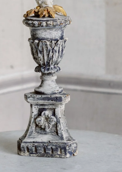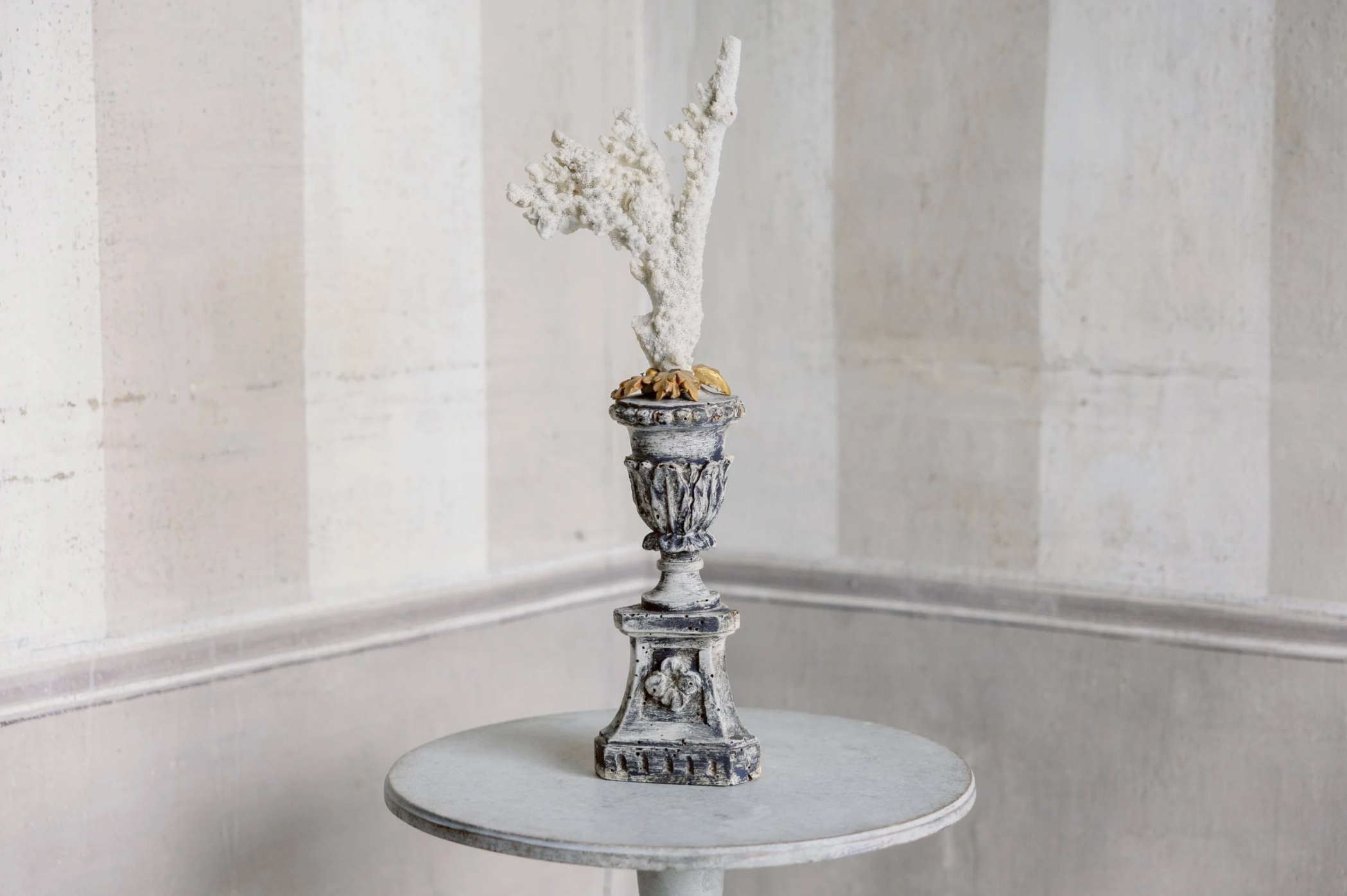 The Alessia Antique Coral features a stunning white coral centerpiece set on an intricately carved antique base. Its elegant patina blends shades of grey, white, and black, accented with subtle gilt detailing on top, creating a timeless decorative piece that adds refined sophistication to any space.