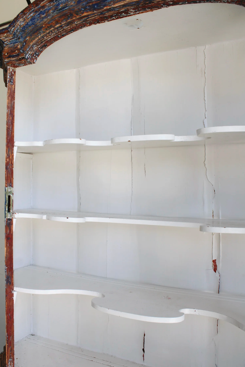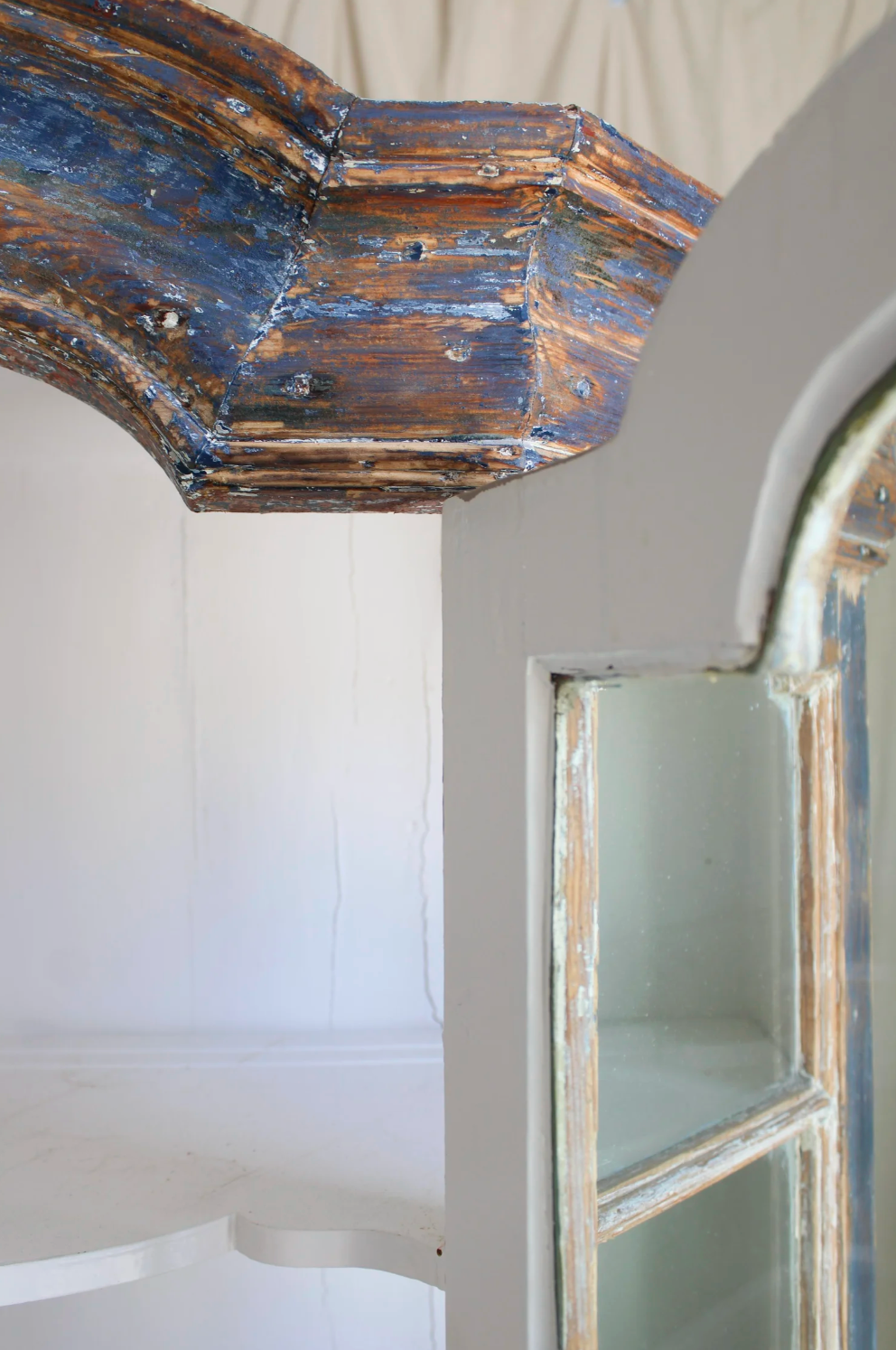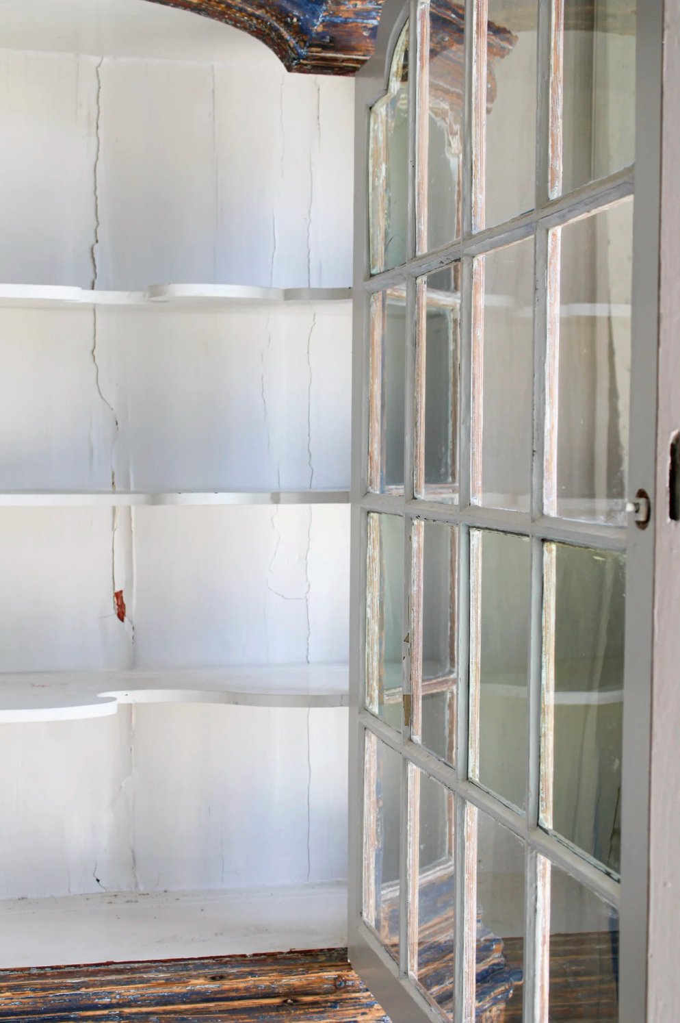 Showcase your finest china with this Antique Swedish Birgit China Cabinet, featuring a beautifully distressed blue exterior that adds timeless charm. The crisp white interior highlights scalloped shelves, ideal for elegant display. Secure your treasures with built-in keyed locks on both the upper glass-fronted section and the lower storage compartment, blending practical security with refined style. This piece offers both sophisticated presentation and additional concealed storage, making it a perfect addition to any classic home.