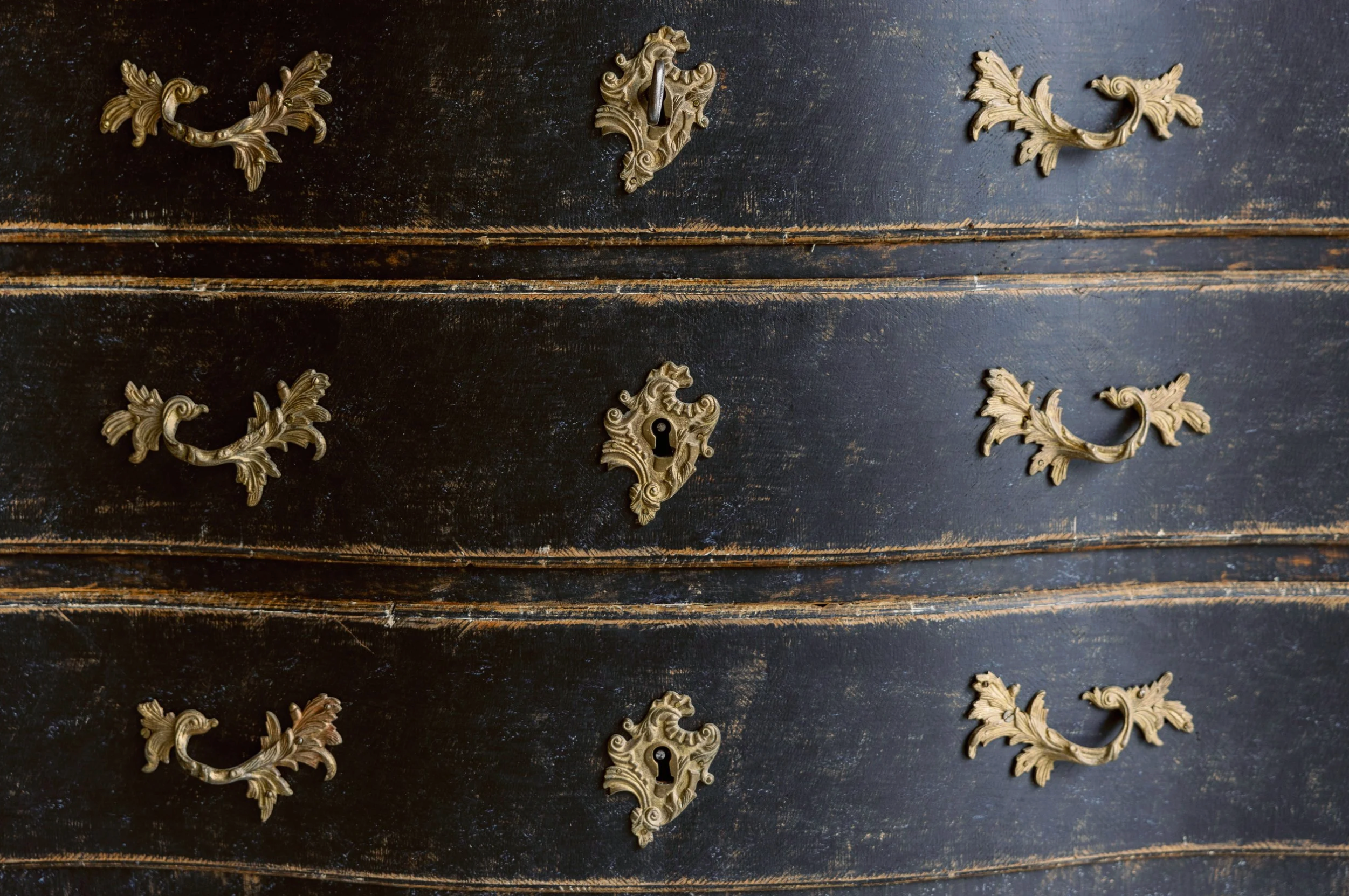 The Gabriel Antique Commode showcases exquisite Swedish craftsmanship with its elegant black, wavy front design accented by refined gold hardware. This piece offers timeless beauty and intricate detail, making it a sophisticated addition to any interior seeking classic charm and functional artistry.