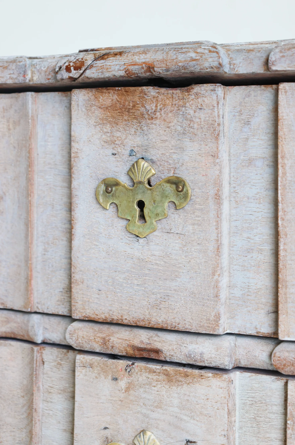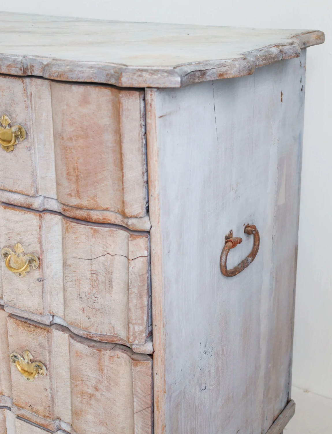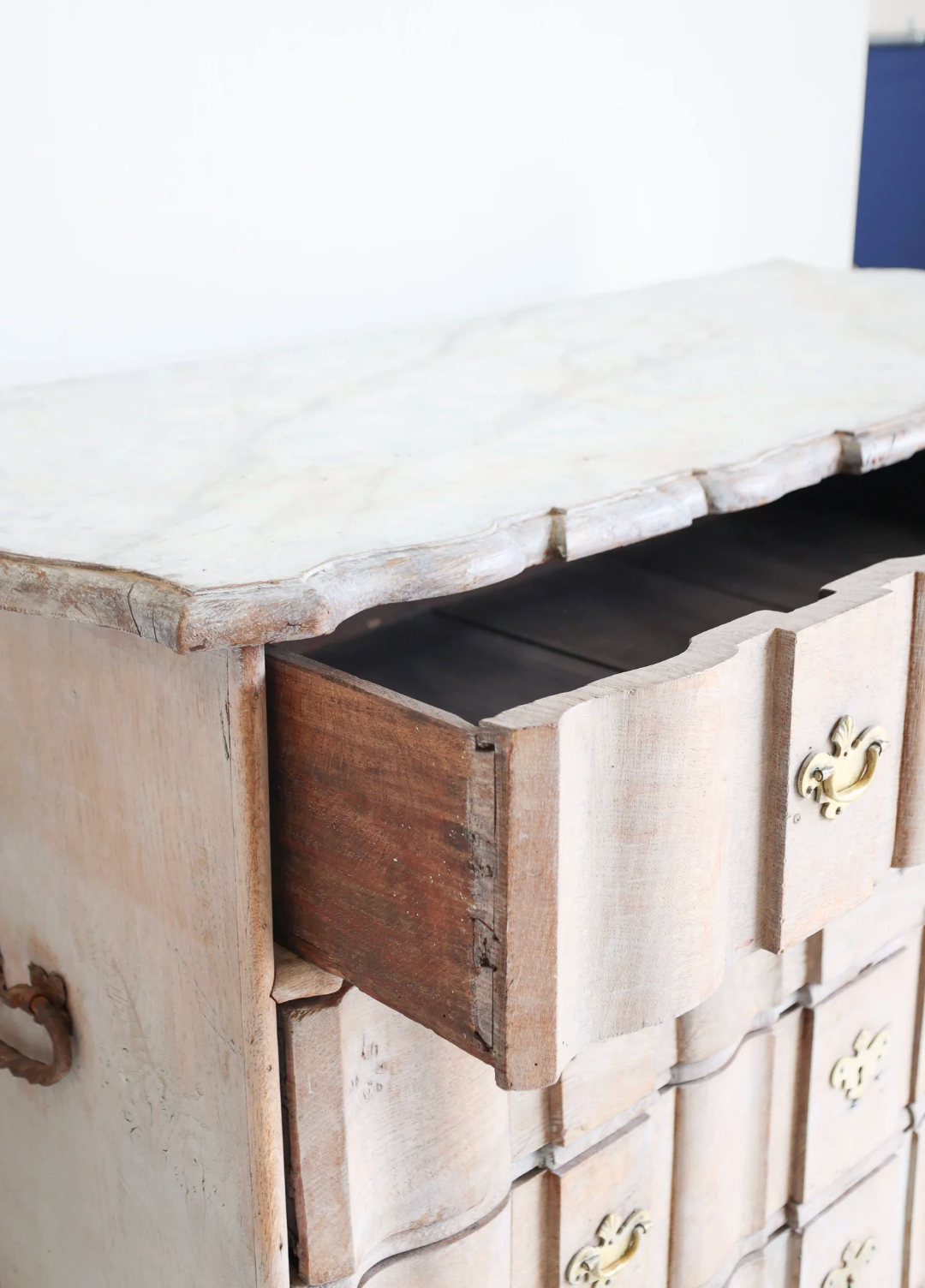 The Antique Lennart Commode showcases timeless Swedish craftsmanship with its elegant carved silhouette and four spacious drawers. Finished in a light washed, bleached wood that highlights the grain’s natural beauty, this piece is accented by refined gold-toned hardware. Its graceful curves and subtle detailing blend sophistication with practicality, making it a stunning and functional addition to any refined interior.